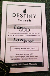 We hop in the car this Easter Sunday with Destiny Church in Rochester set as our destination.  Its a little different today because I’m blessed with the the company of another (Alicia) on my way there–not something I’m used to but I’m very happy nonetheless.  We arrive and park in the exact same parking spot as last week and head inside.  Immediately when we walk in there is a greeter by the initial door who hands us a program and introduces himself to each of us.  They still know me as a newcomer–which I am because its still only my second time ever visiting this church.  I’m pointing this out again because they noticed, which is amazing–points for Destiny! The second greeter sees us also and explains where we can get some food and coffee if we would like it before harvest begins.