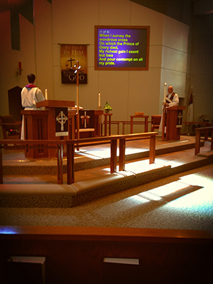 This church was set up really well. Instead of having only a couple of sections of pews extending back further they wanted everyone to be closer, so they structured a round alter and basically 180 degree seating area around them. The pews were only about fifteen rows deep per section—brilliant! It gave the essence that everyone at service was closer, and there for a reason.