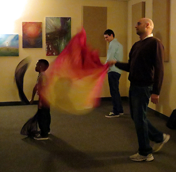 Some interesting things happened during these songs though, I’m excited to tell you. I witness a woman up front dancing with a silk flag. Then I look and I see a man up front doing the same—and