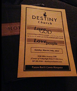 Ahh Sunday. A new experience in a new church. Today I’m venturing to Destiny Church in Rochester, MN.